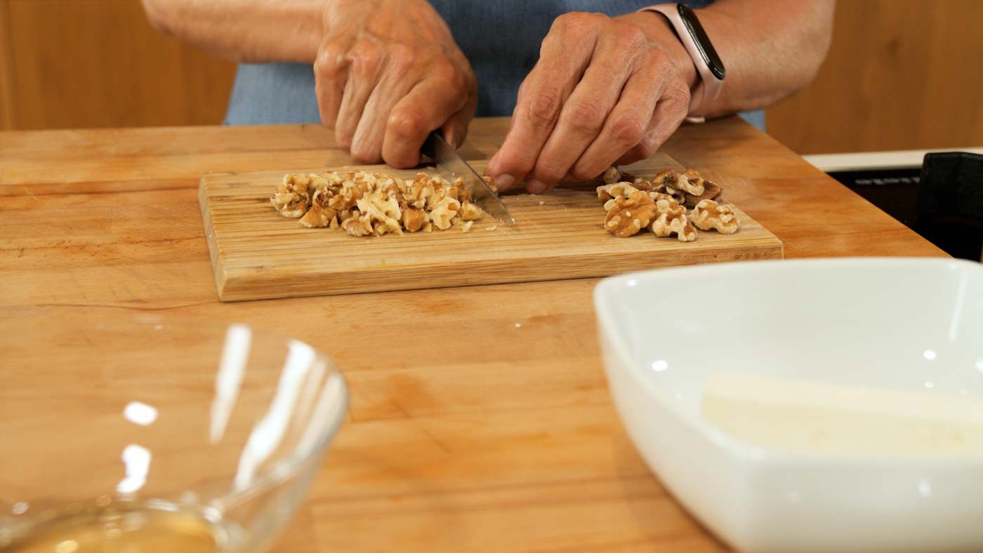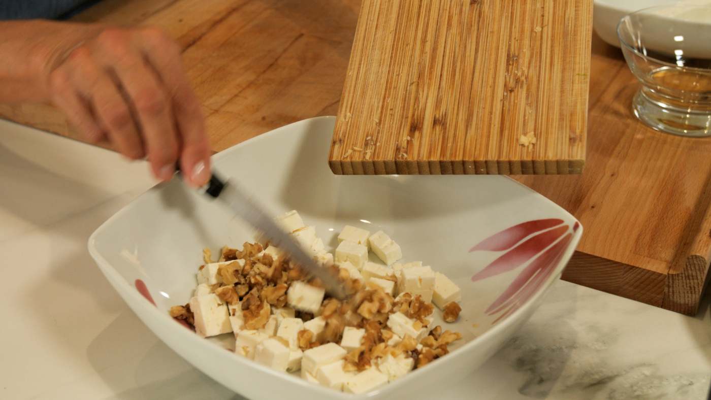 4. Els afegim el formatge tallat a daus, les nous trossejades, la sal, el pebre bo i l’oli d’oliva (hem de ser generosos amb l’oli)