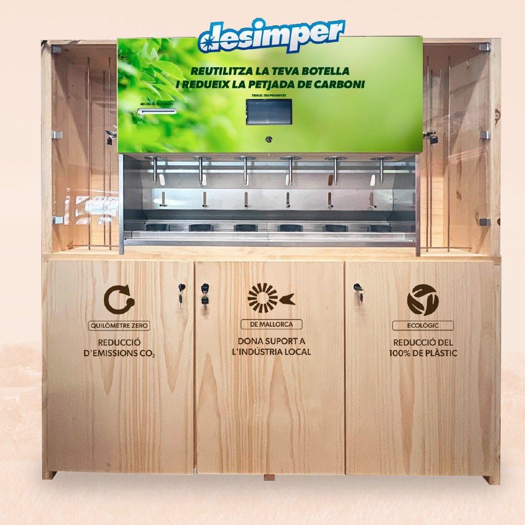 El dispensador autoservei de 6 productes on cada client de forma còmoda podrà adquirir la botella i omplir-la amb el producte desitjat. Aquesta botella adquirida servirà per ser reutilitzada a la màquina, així, a partir del segon ús, contribuïm amb el medi ambient eliminant la petjada de carboni el 100% l’ús de plàstic.