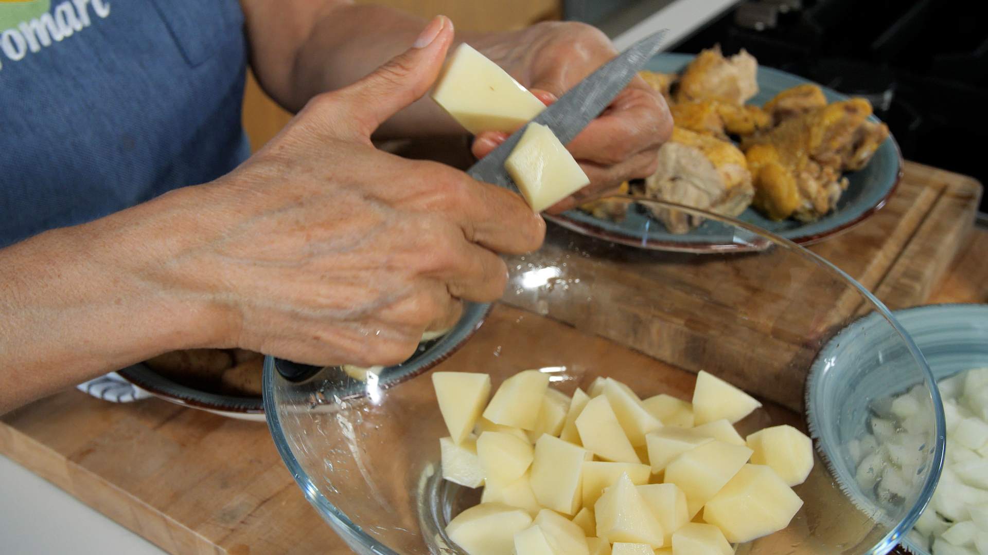- Pelam les patates, les tallam a daus i hi posam un poc de sal.