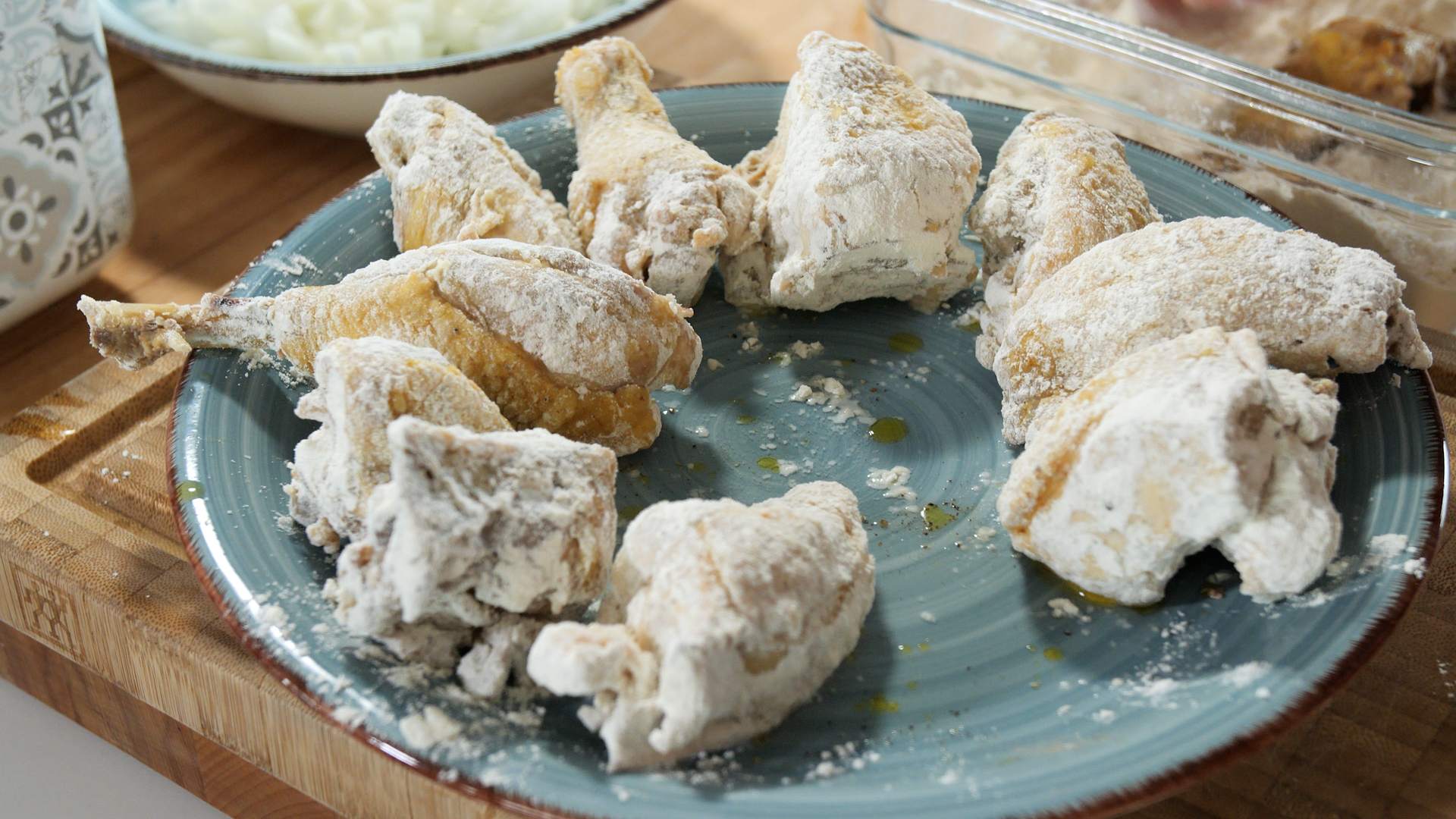 - Salpebrem el pollastre i el passam per farina.