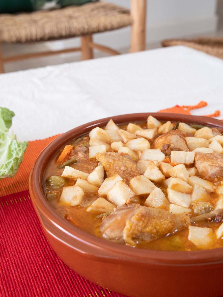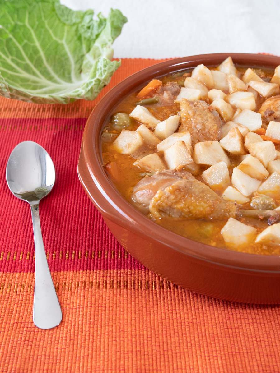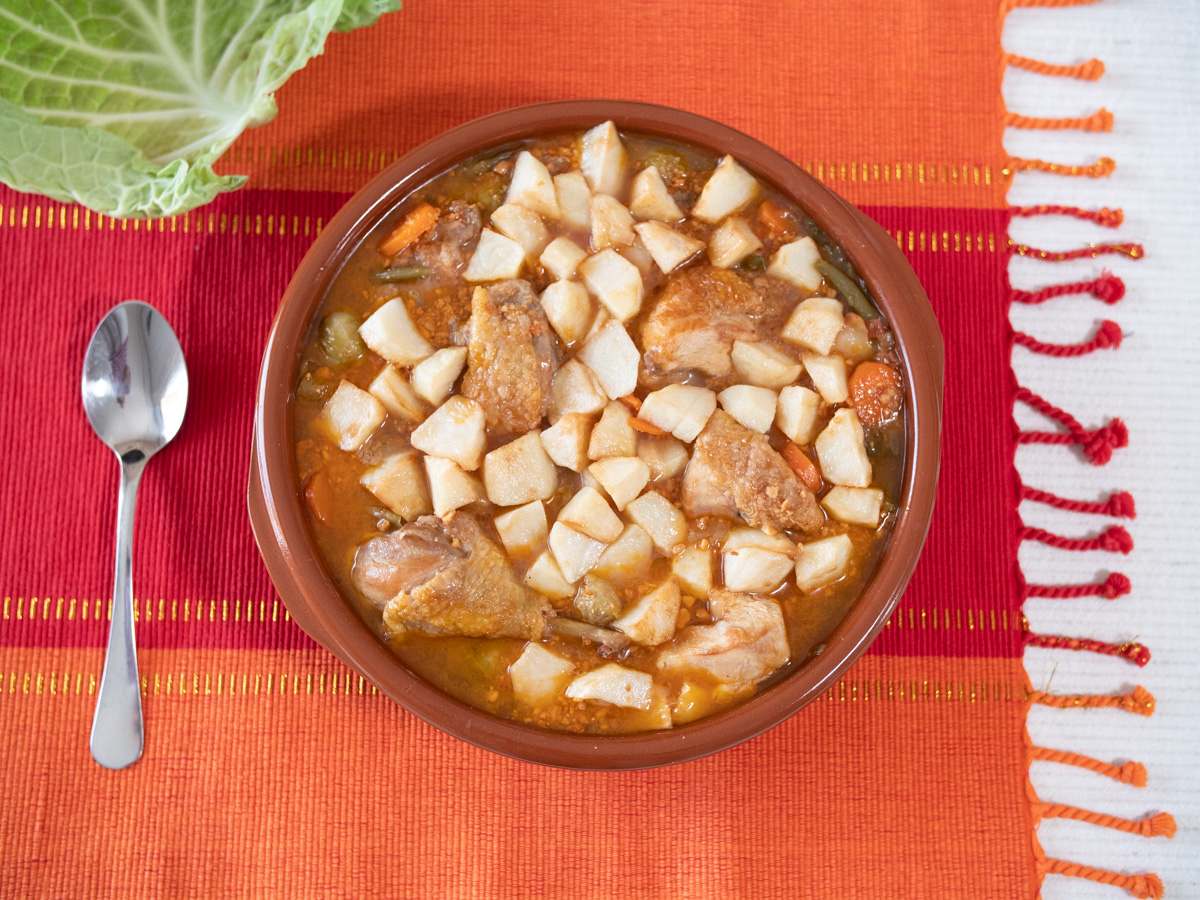 - Dins una greixonera hi posam oli (podem reutilitzar l’oli on hem fregit les patates i la carn), hi sofregim la ceba tallada a daus petits fins que tengui coloret ,seguim sofregint les verdures, les pastanagues, les mongetes, les cols de Brussel·les, les tomàtigues, el llorer, el moraduix, sal i finalment el brandi. Un cop evaporat l’alcohol i sopam el brou fins que tapi completament les verdures.