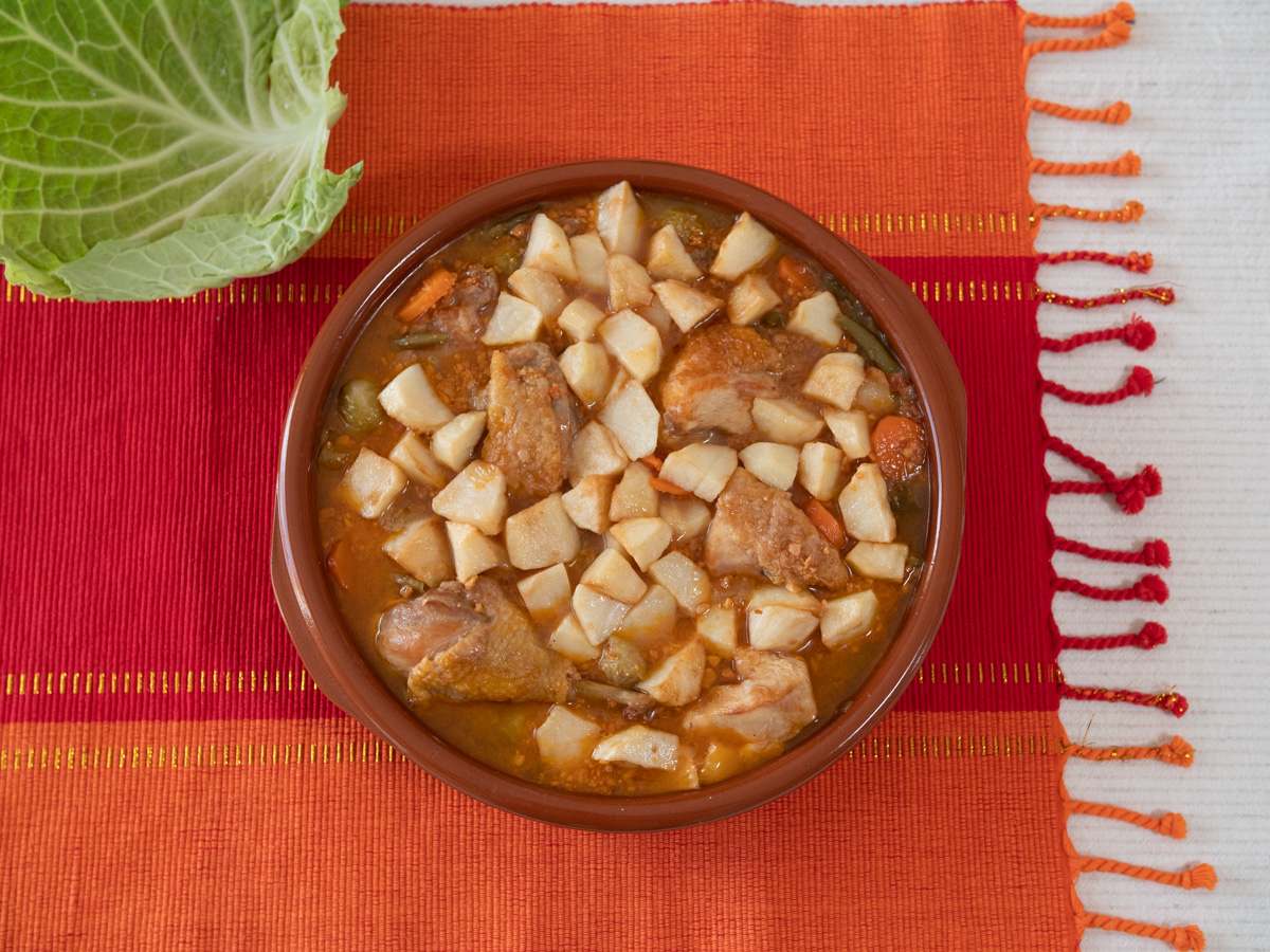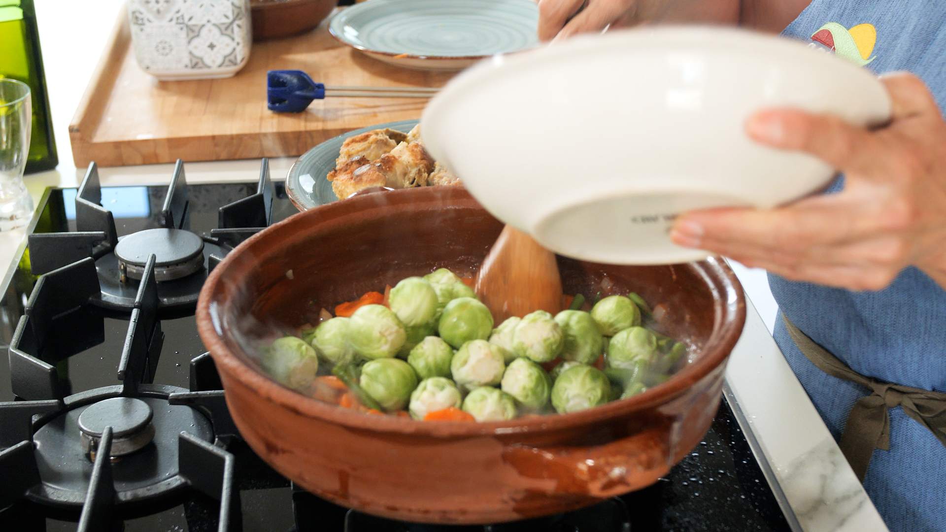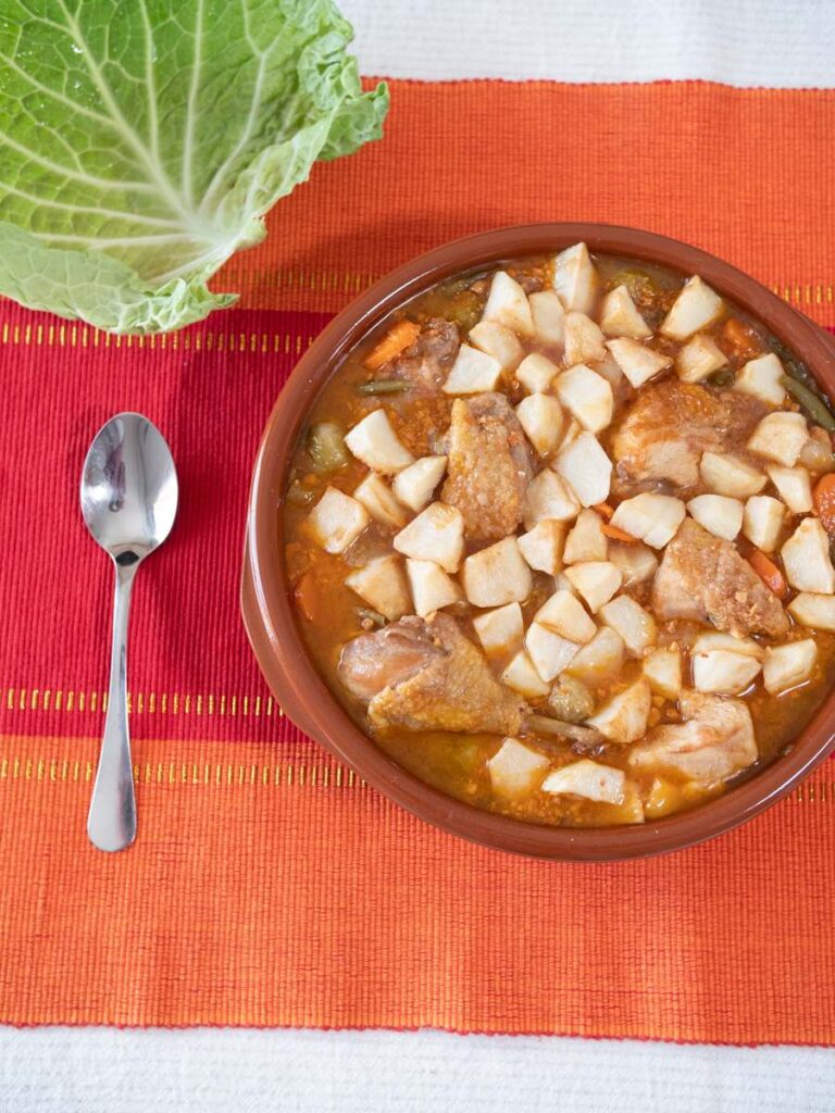 - Dins una greixonera hi posam oli (podem reutilitzar l’oli on hem fregit les patates i la carn), hi sofregim la ceba tallada a daus petits fins que tengui coloret ,seguim sofregint les verdures, les pastanagues, les mongetes, les cols de Brussel·les, les tomàtigues, el llorer, el moraduix, sal i finalment el brandi. Un cop evaporat l’alcohol i sopam el brou fins que tapi completament les verdures.